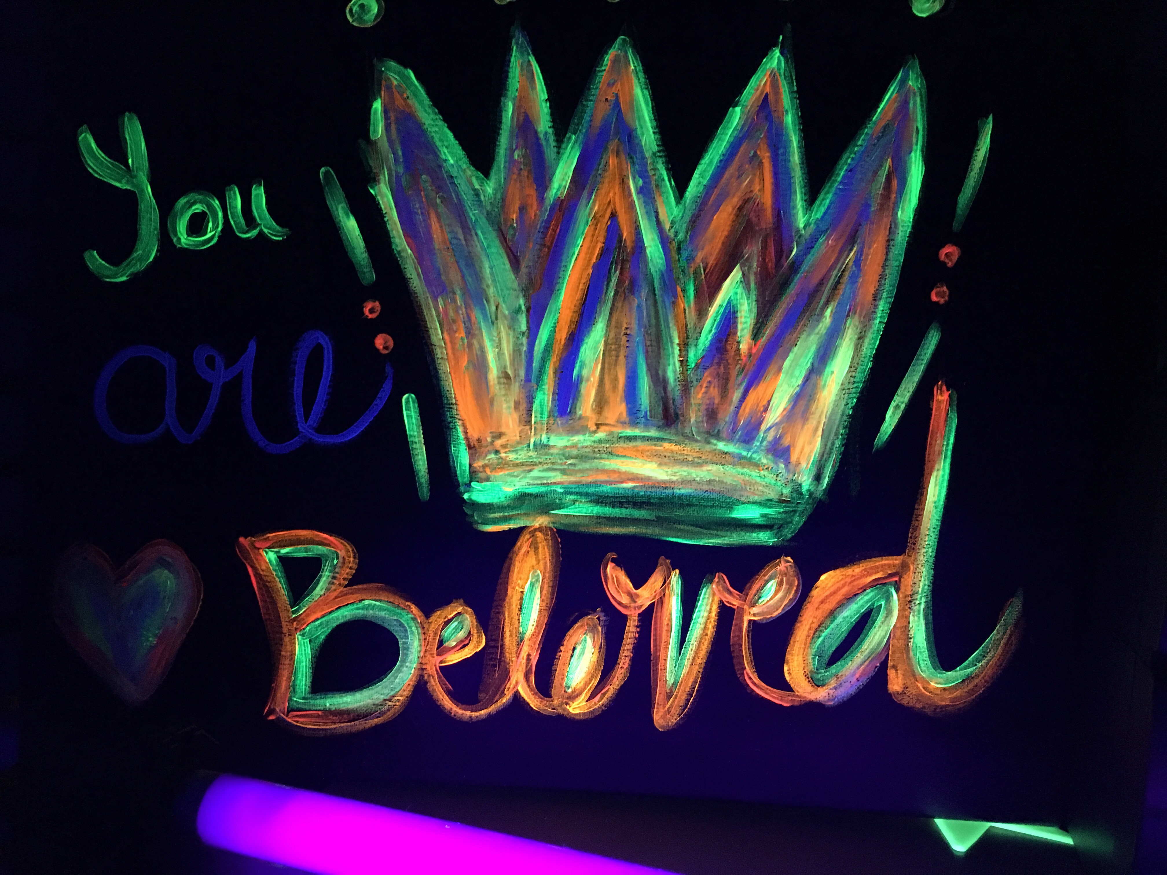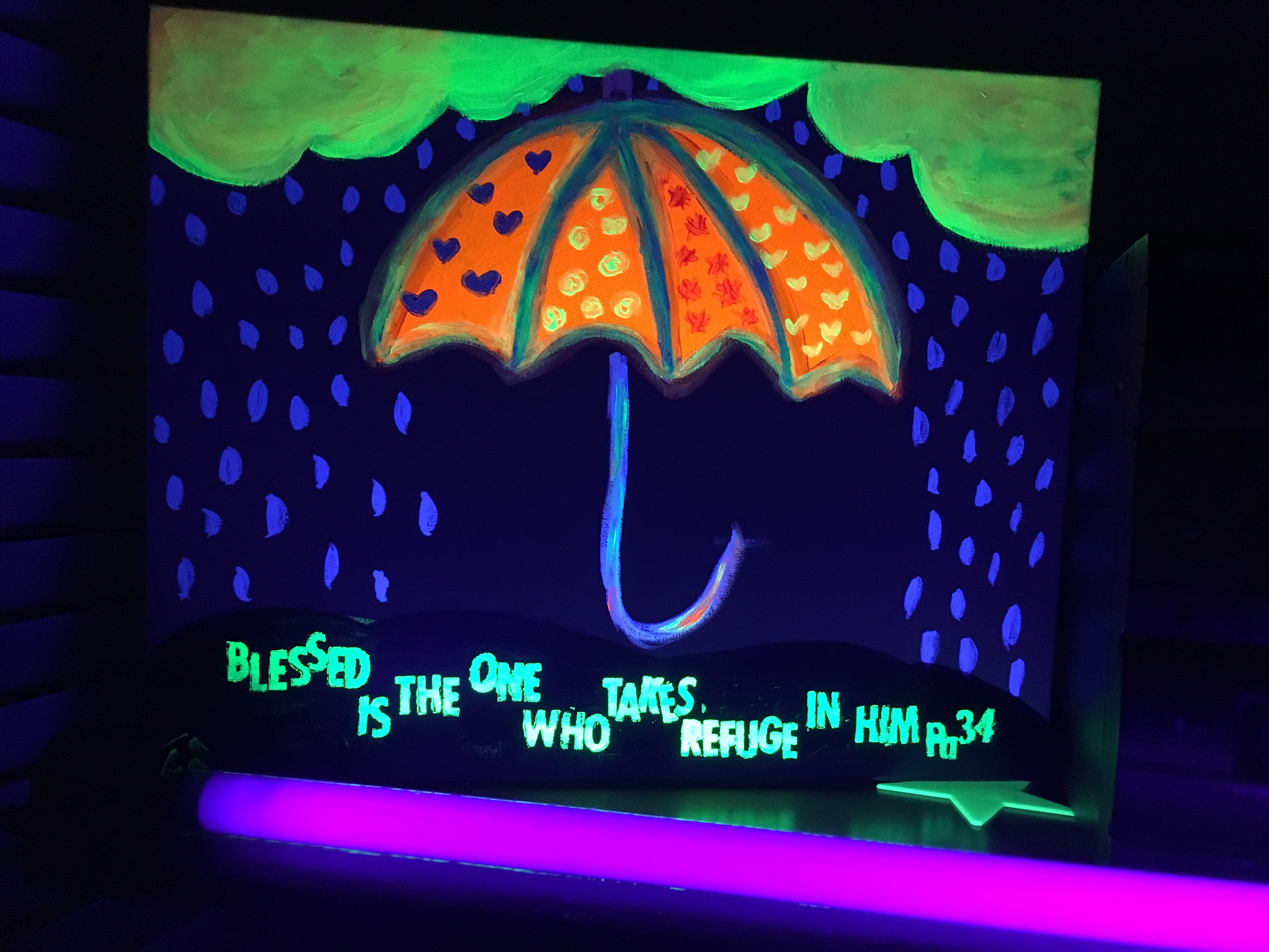 I’m pretty obsessed with painting under a black light. I Just wanted to share some of my latest glow art paintings. I made this one for my Son. I have shared this scripture with him since he was teeny tiny.